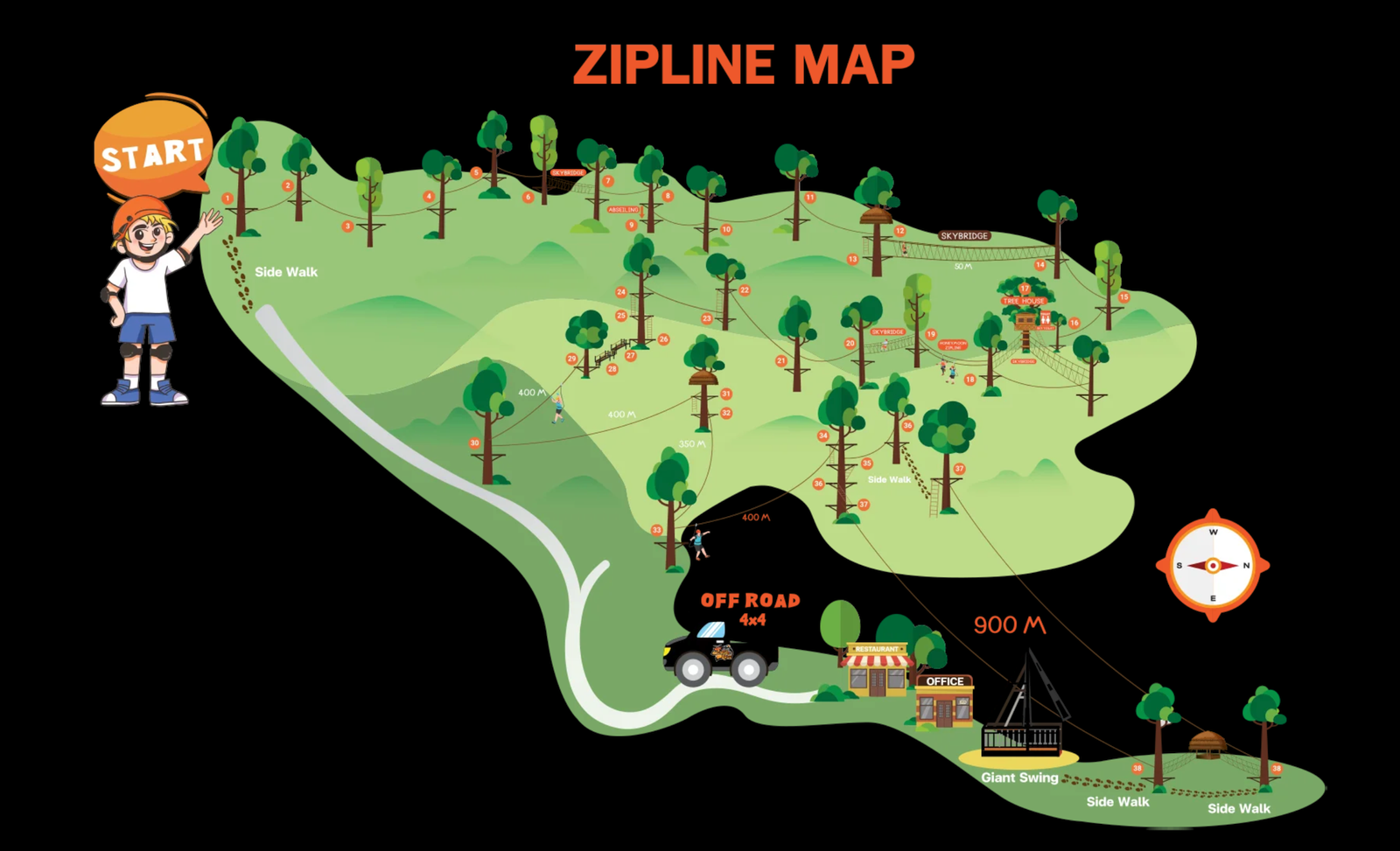 • 21 tirolinas, incluyendo 5 muy largas (900 m, 400 m, 350 m)